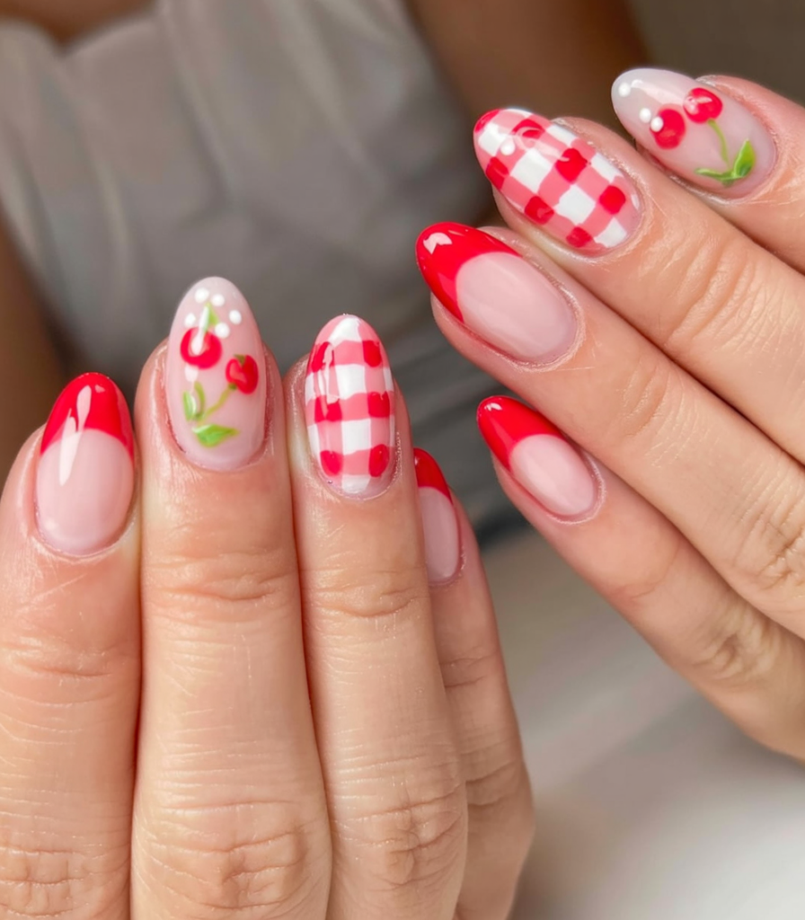 This vintage-inspired design combines cherry elements with French nail tips and red and white gingham for a timeless, nostalgic result. The 2025 design trend embraces individuality in a way that defines this particular example. The colors evoke summer picnics in Central Park when you choose summer dresses or denim for an outfit.