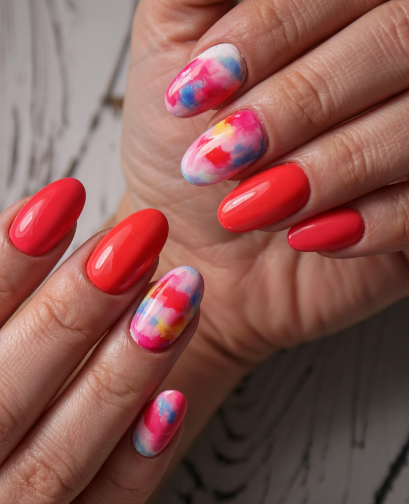 The design features abstract watercolor designs in pink, blue and yellow that merge with solid gel coral red nails to create an art exhibit effect on the nails. Creative individuals as well as those who prefer unconventional nail designs will find this artistic take on traditional manicures as elegant as it is unique. Perfect for summer festivals or gallery openings.
