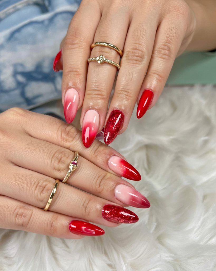 A combination of red “acrylic” polish along with glitter notes and a pink to red “ombre” transition creates this set. An almond shape with glitter adds elegance to the party night look. These nails demand glamour as they can be worn from sunset dinners to rooftop bars.