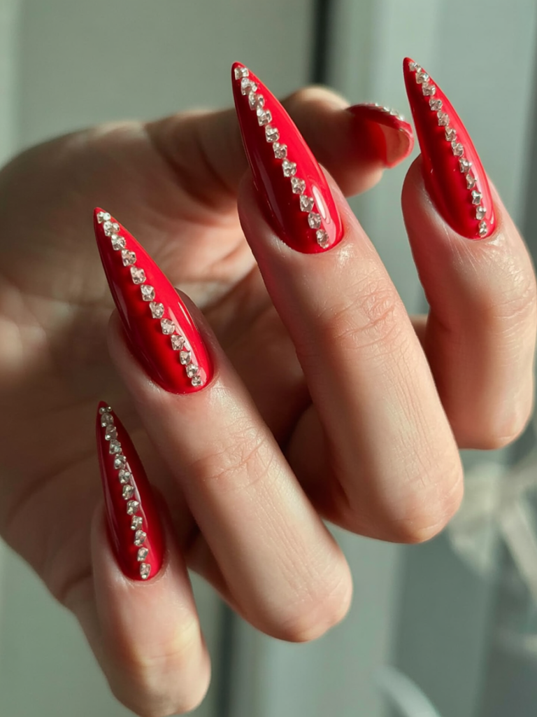 A luxurious set features vertical crystal embellishments adorning gel red polish along each nail. Almond nail shapes act as a sophisticated plank to showcase the dazzling accents in this design. These nails deliver high-end elegance that works perfectly for formal black tie events as well as stylish evening occasions.