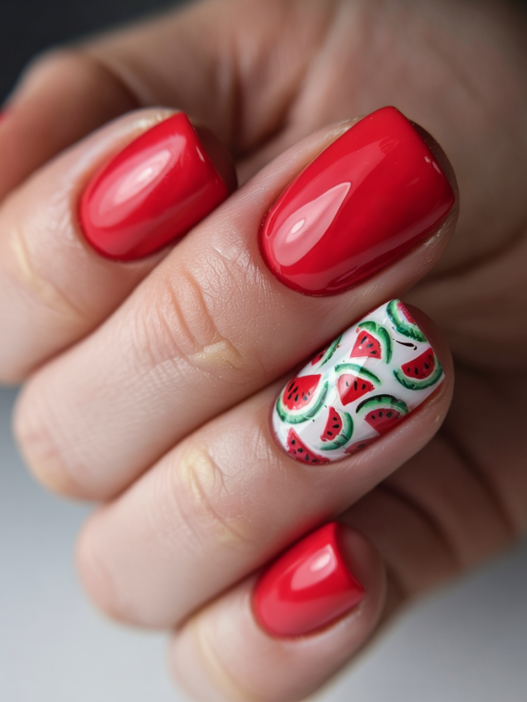 A fresh interpretation of this design features square red nails with a glossy finish and watermelon pattern accents. Red nails in square geometric shapes offer a summery motif perfect for weekend getaways or poolside relaxation. This manicure look draws attention while staying just under the volume limit.