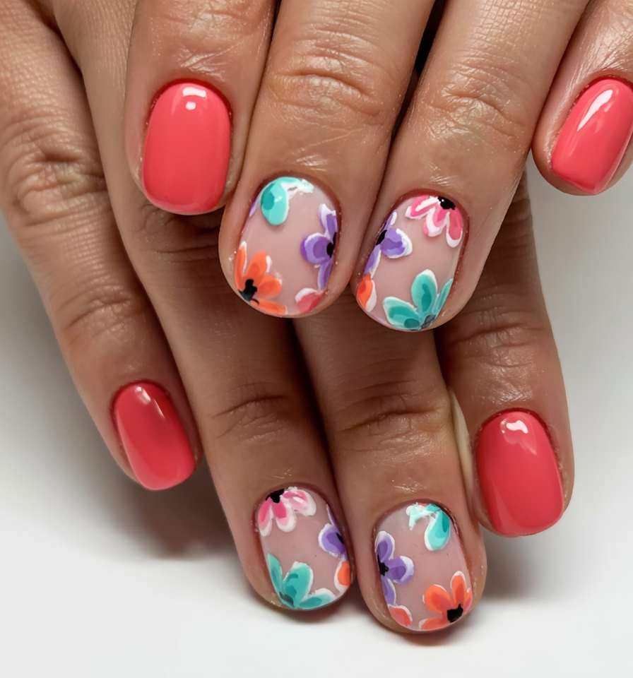 A combination of informal and formal elements makes this look an ideal choice for everyday wear. The manicure features coral gel polish along with translucent accent nails featuring hand-painted flowers in purple, teal and 2025 pink. This design perfectly matches the ideal amount of nail art along with natural <data-start=”1256″ data-end=”1267″>natural appeal in chic minimalism. Round and square nails will bring this design to life as it perfectly captures the essence of blooming summer gardens.