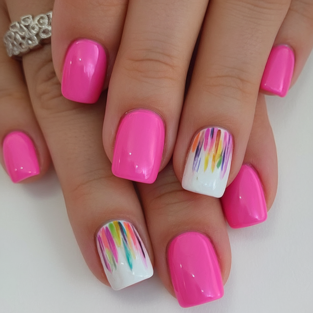 This bright pink set brings out the playful heart of summer, blending bold color with a touch of creative flair. Two accent nails feature a white base layered with vibrant watercolor-like strokes—offering a nod to expressive nail art without feeling overdone. The sleek, glossy finish is perfect for fans of short or medium lengths, and ideal for gel nails that need to last through sunshine and socializing. These nails instantly evoke a fun, artsy mood—imagine yourself sipping a fruity drink on a breezy balcony in Spain.