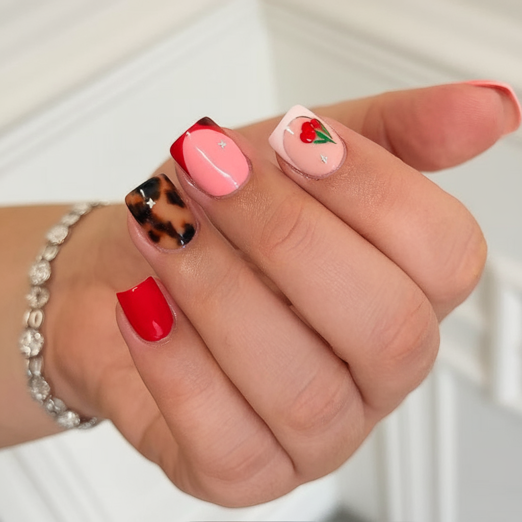 If you’re all about mixing patterns and showing off your creativity, this eclectic design is your 2025 signature. Featuring a combination of black tortoiseshell print, bold red, sweet cherry art, and high-gloss accents, it’s a fusion of funky, fashion, and fruit-forward fun. Ideal for short nails and perfect if you love gel nails or dip nails, this look will match your coolest sunglasses and a confident summer attitude.
