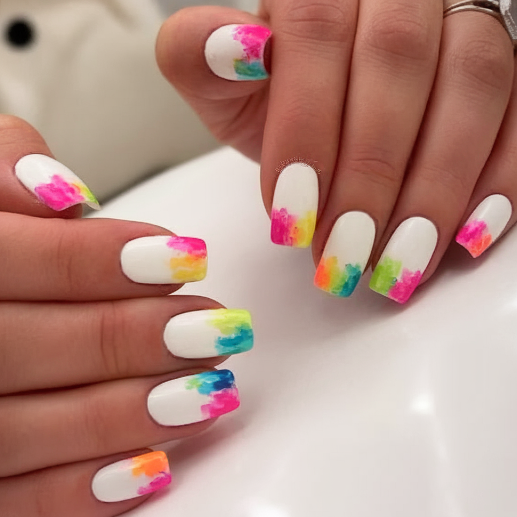 If there’s one look that screams bright and fun, it’s this neon burst on a crisp white base. Think electric pinks, yellows, greens, and blues brushed on like watercolor—soft, yet striking. The square shape keeps it modern and wearable, while the design adds an artsy, edgy vibe. Perfect for lovers of minimalist design who still want a pop of color.