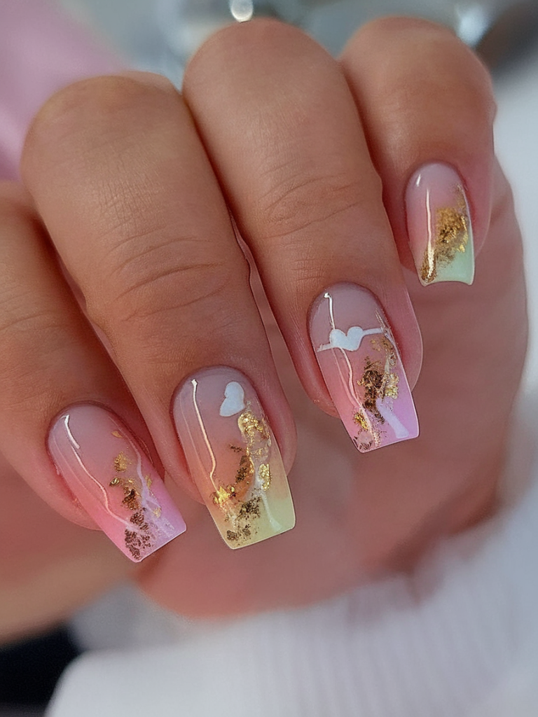 This design is for the women who want classy, elegant, and a touch of dreamy whimsy. Featuring pastel tones in a smooth ombré fade and speckled with gold leaf accents, this gel nails style feels straight out of a luxury editorial spread. The subtle 3D effect from the foil makes this perfect for upscale occasions without being over-the-top.