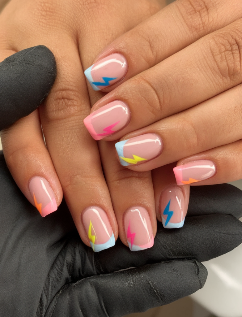 A bold twist on the french tip, these nails fuse neon lightning bolts with simple pastel bases. Ideal for fans of a clean nail bed with a zap of personality at the tip. With colors like pink, blue, and yellow, it brings retro comic book vibes into 2025’s nail scene.