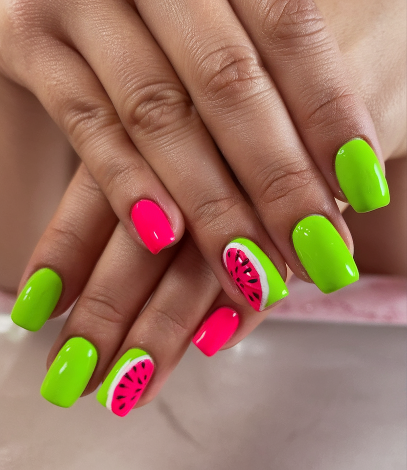 Cute doesn’t even begin to cover this look! With alternating neon green and pink nails plus two adorable watermelon slices painted with meticulous detail, this design is a fresh take on tropical summer energy. It’s the kind of manicure that will make everyone ask, “Where did you get that done?”