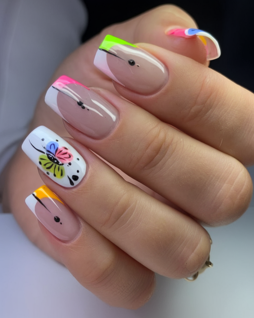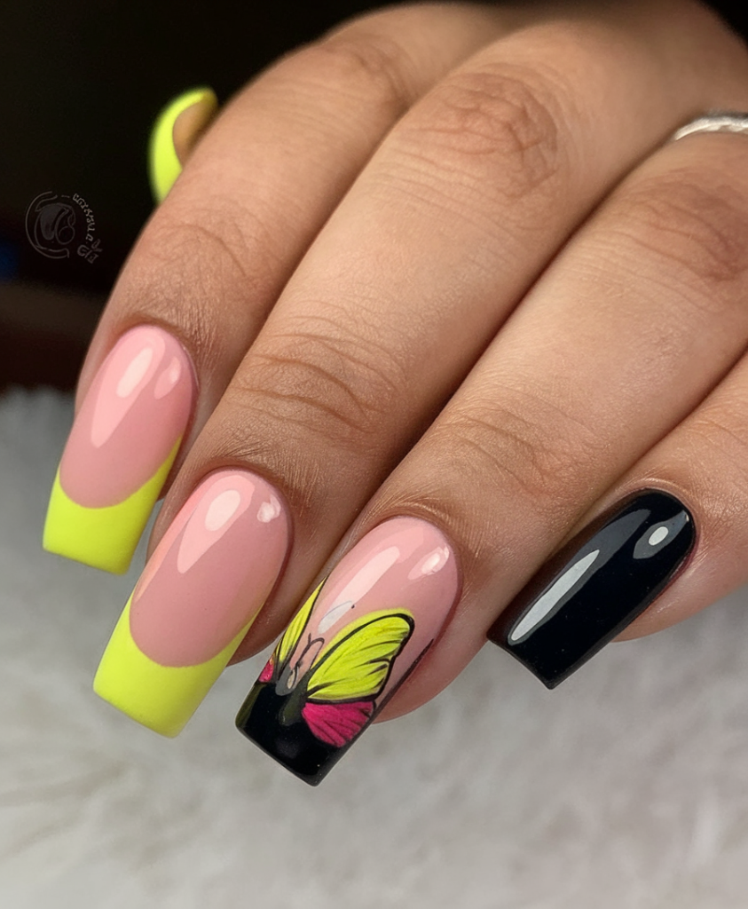 Butterflies are having a major moment in nail art, and this design proves why. Each long gel nail features colorful, hand-painted butterflies paired with neon-tipped french tips. The pops of black contrast give the style a graphic edge, while maintaining a whimsical air. This look is made for fashion-forward women who want their nails to start conversations—elegant, fun, and full of charms.