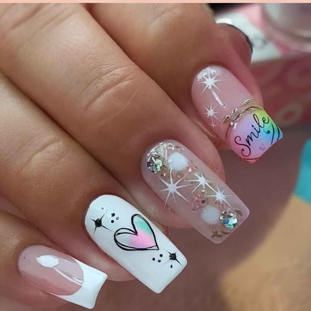 A sparkling collage of rhinestones, starlight art, and colorful script, this nail design blends 3D charms, transparent gels, and hand-drawn details. The word “Smile” pops out in rainbow hues, making it as much a mood booster as a style statement.