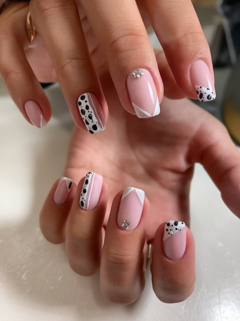 This one’s a sophisticated spin on the animal print trend with black dots, angled white tips, and rhinestone accents. The short square shape makes it practical, while the quirky design keeps it fashion-forward. Pair it with monochrome outfits to really make the nails pop.