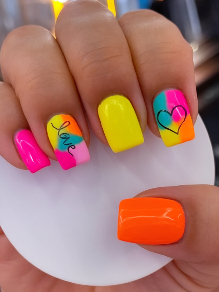 Unapologetically bold, this long square set features blocks of neon yellow, pink, and orange paired with abstract heart and “Love” decals. It’s funky, fearless, and ideal for creative souls who want their nails to speak volumes.
