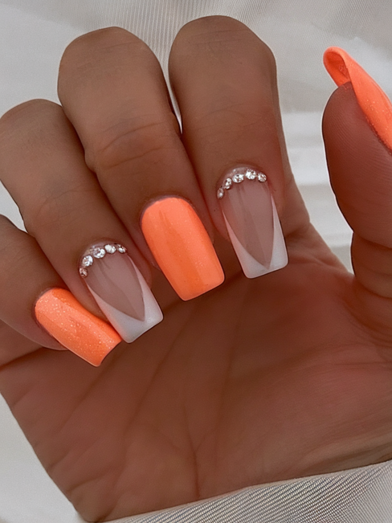 This striking long acrylic design screams summer sophistication. With bright orange polish alternating with french tip-inspired nude bases, the added rhinestone charms take the entire set up a notch. Whether you’re heading to a rooftop party or a beach wedding, this classy yet funky look keeps you glam from day to night. The slight shimmer gives it a luxe vibe that’s both elegant and trendy for 2025.