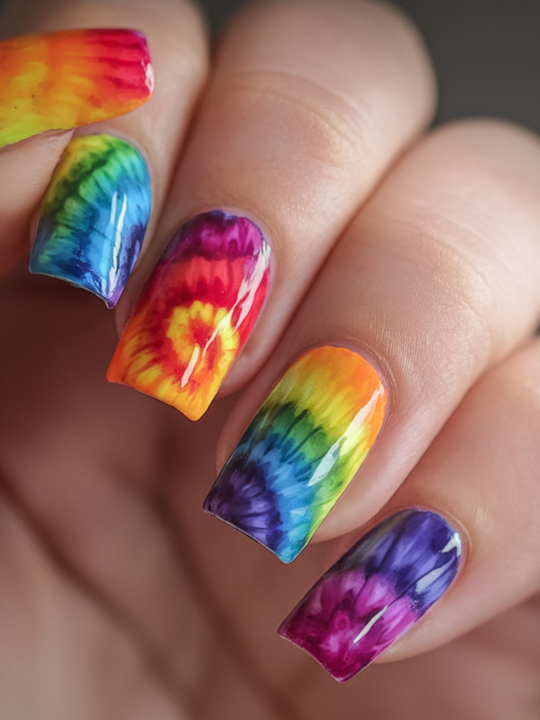 This vibrant tie-dye look is straight from a 70s music fest and reborn for 2025. Swirls of rainbow colors create a psychedelic masterpiece on each finger. If you’re into color theory and kaleidoscope visuals, this one’s calling your name.