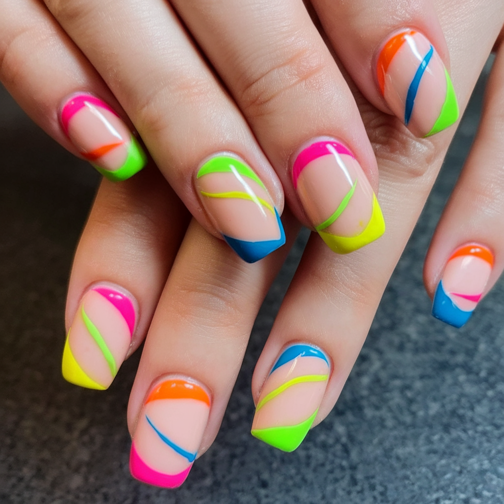 Imagine twisting neon ribbons around your fingertips, and you’ve got this electrifying nail look. With bold color-blocked french tip edges in blue, pink, green, orange, and yellow, each nail features swooping, intersecting lines that bring motion and dimension to the design. Set on a neutral sheer base, the brightness pops without overwhelming the eye.