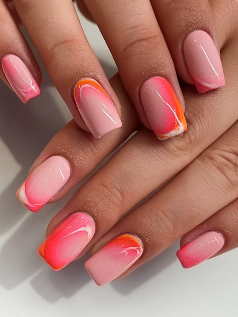 If you’re into soft beauty that feels straight out of a high-end sunset photoshoot, this is your match. These medium square nails swirl peach, pink, and coral into a dreamy marble design that evokes a tropical sunset melting into the horizon. The painterly blend looks fluid and effortless, ideal for fashionistas who love a luxe minimalist moment.