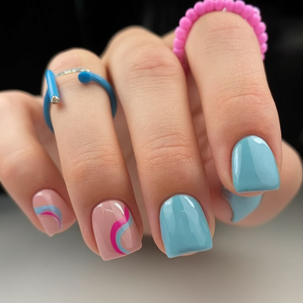 These blue and blush nails strike a stunning balance between simplicity and nostalgia. A few nails are painted solid sky blue, while others are adorned with retro-style curved lines in pink and blue against a natural nail base. It’s a simple, playful nail art concept that feels both wearable and artistic. Perfect for a relaxed beach vibe or weekend brunch, this look flatters short nails and brings a light, airy mood to any outfit.