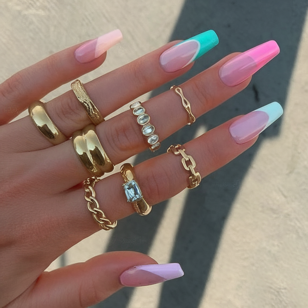 If you’re channeling tropical vacay vibes, this long acrylic style is a must. Featuring a gradient of pastel pink, turquoise, and white in a sleek french tip layout, these nails scream Spain getaway. The look is elegant, fresh, and versatile, complementing breezy linens and gold jewelry effortlessly. This style is summer luxury at its finest and works beautifully for both pool parties and elegant dinners.