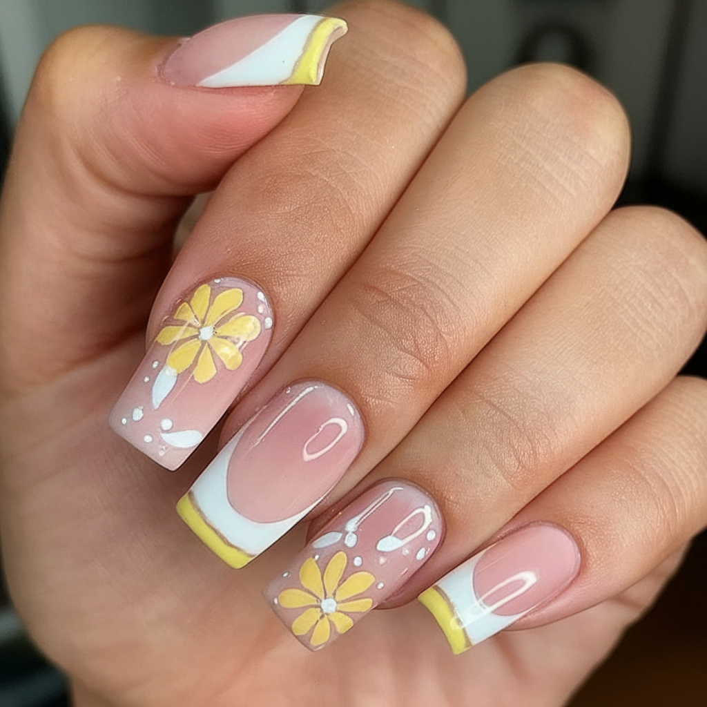 Flower lovers, this one’s for you. These medium square nails combine soft nude tones with hand-painted yellow flower details and swirled white french tips. Delicate and feminine, this gel nail set is perfect for sunny days, picnics, or garden parties. The 3D effect of the petals gives it that fashionable edge that feels straight from a runway yet grounded in warm-weather reality.