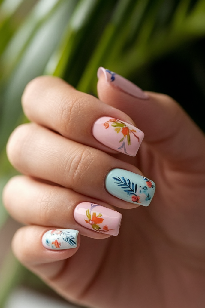 This floral dip nail look makes a bold yet delicate statement. Painted in alternating soft pink and powder blue, each nail features intricate flower and leaf motifs, giving it a fresh-from-the-tropics feel. It’s a dreamy combo for lovers of natural nails who want a lightweight, breathable summer manicure. Feminine, artistic, and oh-so-Instagrammable.