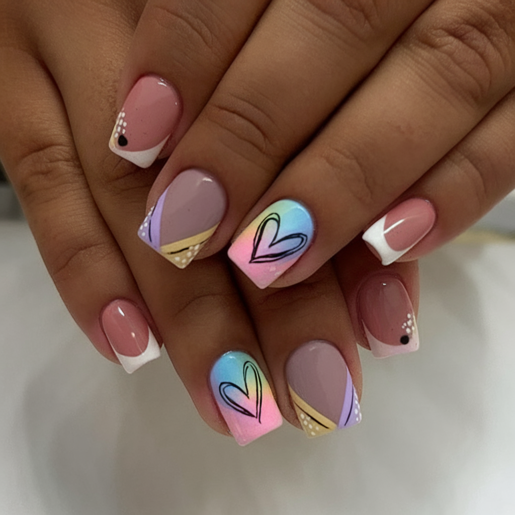 This cute design combines everything you want in a summer manicure: pastel gradients, graphic hearts, and playful geometric borders. The square shape keeps the look clean, while the varied elements—white tips, dotted details, and golden accents—create a storybook feel. It’s youthful without being childish, and totally on-trend for anyone wanting funky and fun vibes this 2025.