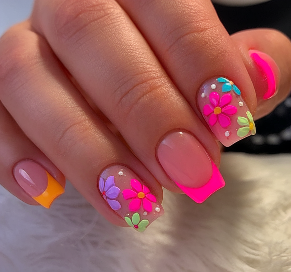 Bold and bursting with color, this short acrylic floral set is a tropical garden on your fingertips. The translucent base lets the neon flowers do all the talking—each petal popping in pink, orange, blue, and green. A few french tip accents tie the design together, giving it structure. This look exudes a sunny, carefree mood that’s perfect for vacation season or simply injecting joy into your everyday style.