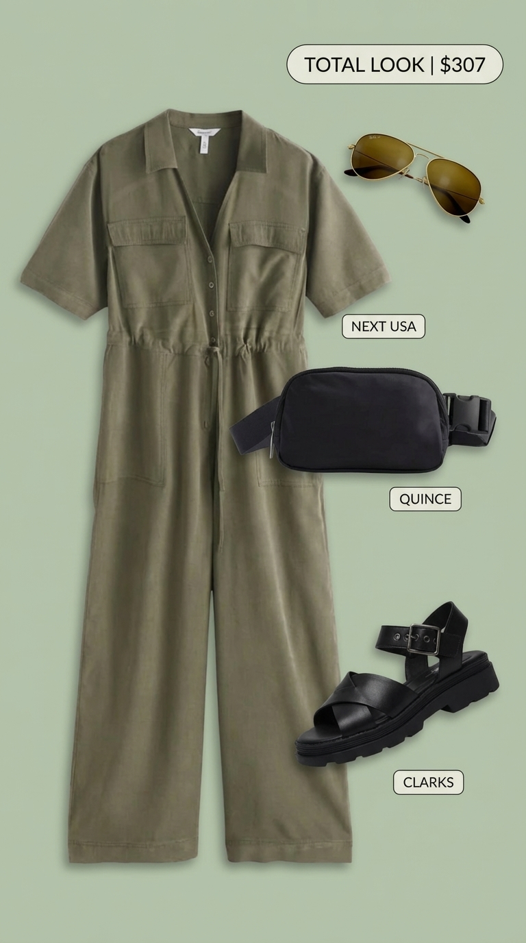 For another take on versatile adventure wear, this safari-chic outfit centers on a khaki green Short Sleeve Utility Jumpsuit from Next USA ($117). Its cotton twill fabric is both durable and breathable, ideal for active sightseeing. The look is accessorized with a hands-free nylon belt bag ($26) to keep essentials secure and comfortable black leather cross-strap sandals ($100) designed for all-day walking. The total cost for this practical and stylish single-piece look is $306.99.