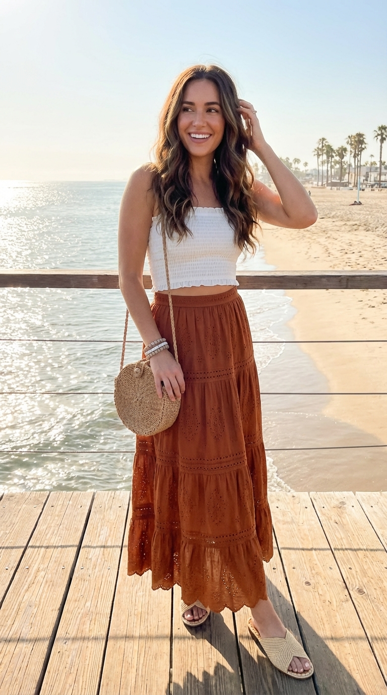 From a fancy evening to a relaxed beach day, this bohemian outfit channels an earthy, laid-back vibe. The hero piece is a Jason Wu tiered maxi skirt ($48) in a warm terracotta hue, crafted from breathable cotton gauze with eyelet embroidery that’s perfect for warm weather. It’s paired with a cream-colored smocked tube top ($19.99) that stays securely in place during light activity. The look is completed with natural raffia slide sandals ($63) and a stack of wooden bead bracelets ($10) that add texture, bringing the total to $180.98. It’s a beach day staple, no question.