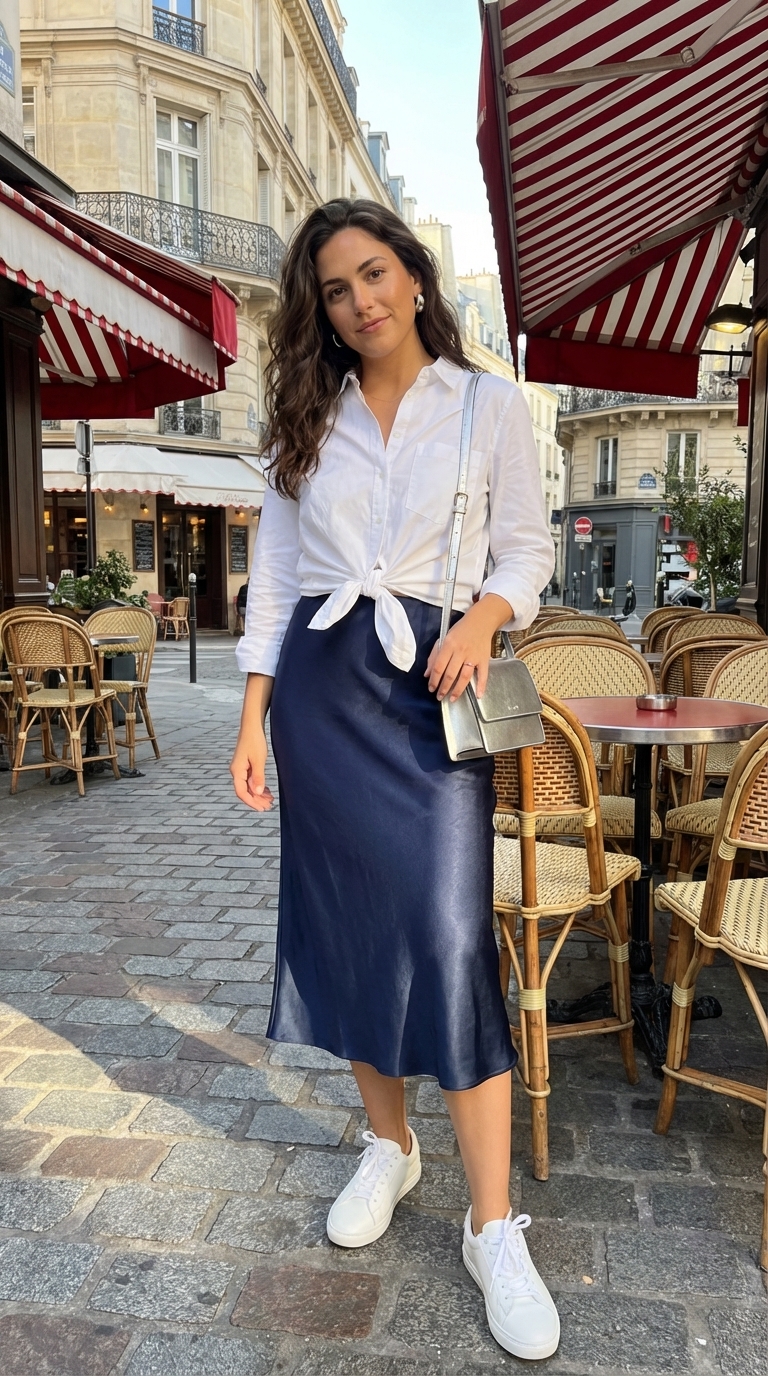 While sandals are great for the beach, a city break calls for chic comfort. This sophisticated outfit is built around the navy blue Everlane Silk Charmeuse Slip Skirt ($134), whose luxurious satin offers a beautiful drape that transitions seamlessly from day to night. It’s paired with a crisp white cotton poplin top ($58.8) tied at the waist, which creates a defined silhouette. For comfortable all-day exploration, the outfit is grounded with modern white genuine leather sneakers ($179.99), adding a fresh, casual touch to the elegant skirt.