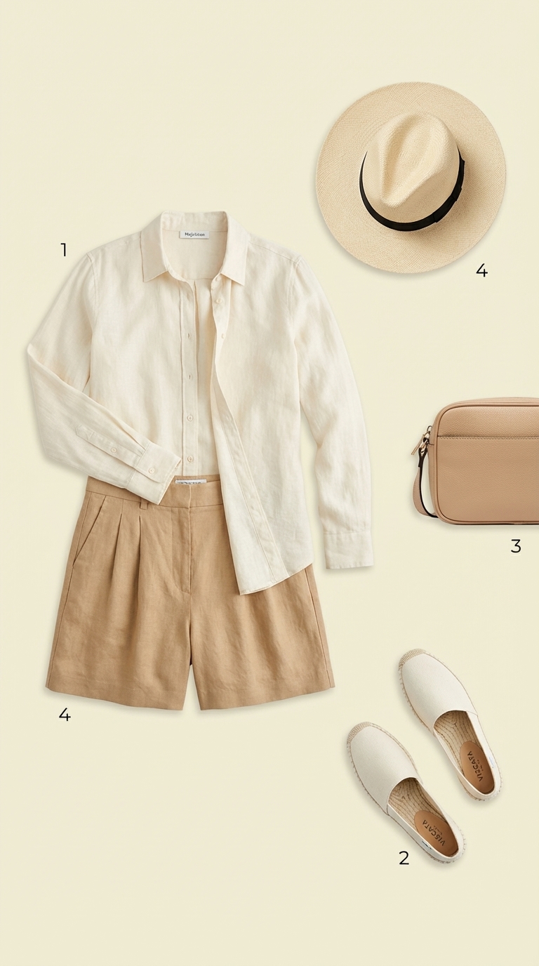 While silk offers one kind of luxury, the breathable comfort of linen provides another, perfect for sunny days. This coastal look is built around the 100% linen MagicLinen long-sleeved shirt ($65.40), seen here in a versatile off-white cream. It’s paired with high-rise pleated shorts in a complementary tan linen blend ($119). Adding to the effortless vacation aesthetic are classic beige canvas espadrille flats ($115) and a chic straw hat accessory ($280) that offers essential sun protection.