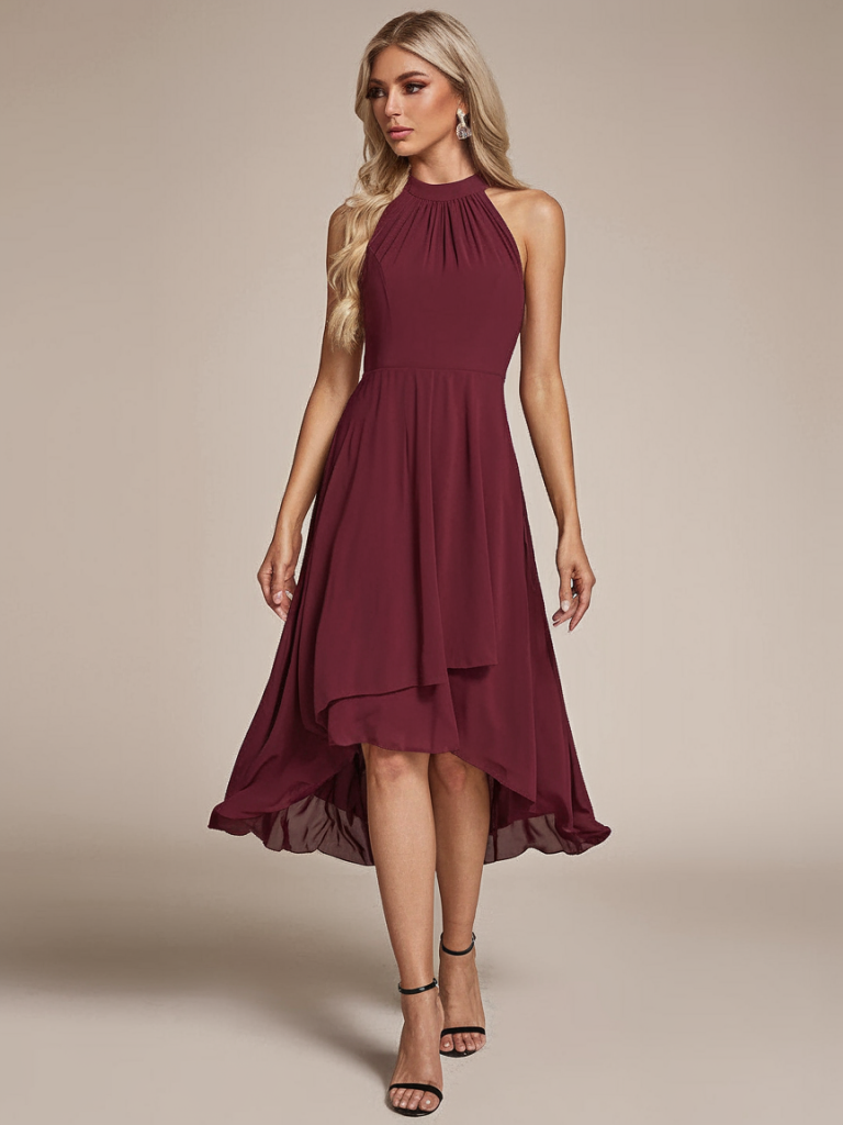 This chic burgundy halter dress with a high-low hemline is an instant showstopper. The flowy chiffon material creates movement, while the halter neckline flatters the shoulders beautifully.