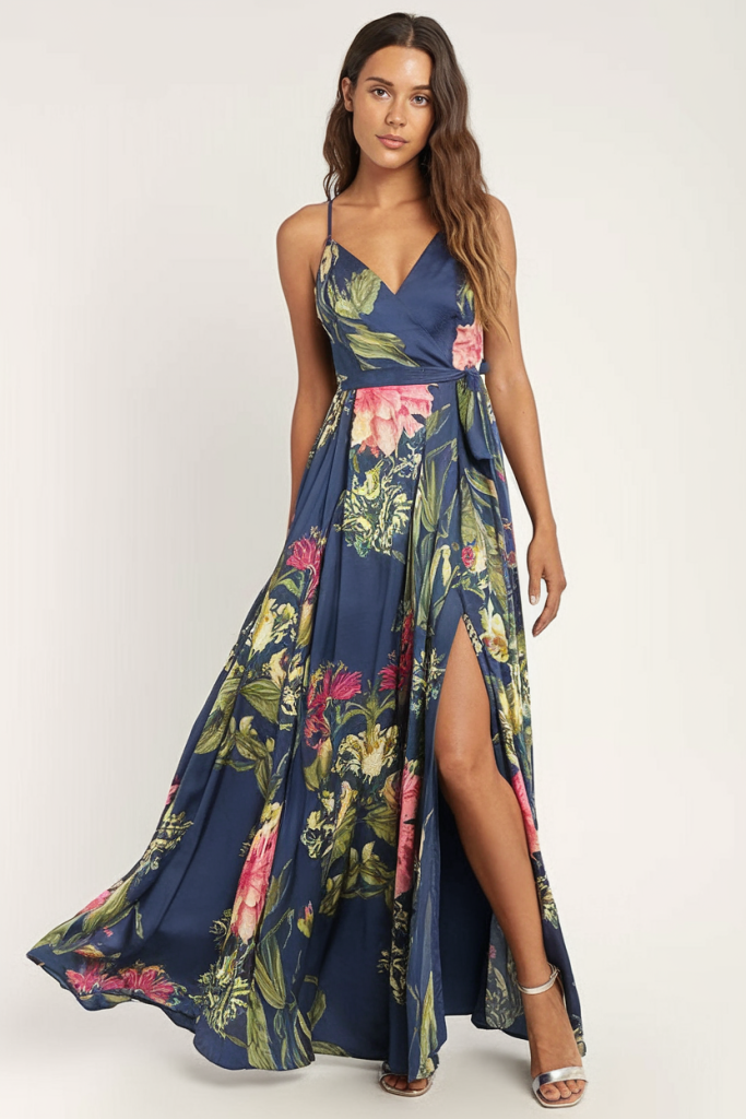 A blue maxi dress is always a standout choice for summer weddings, and this silk wrap dress with bold floral prints is no exception. The deep V-neck and side slit strike the perfect balance between sophisticated and sultry, making it ideal for evening receptions.