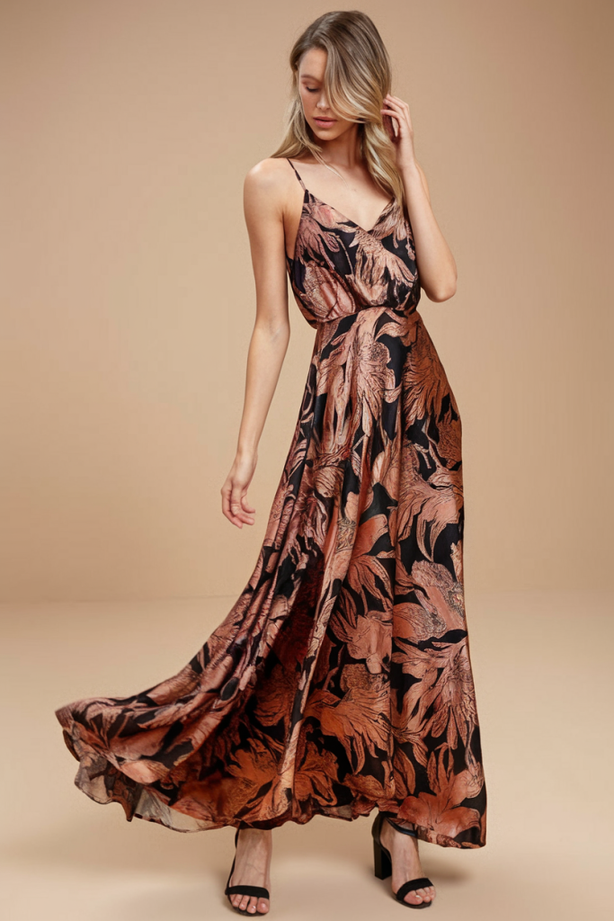 For evening weddings, this satin and silk maxi dress in black and bronze floral patterns is a knockout. The floor-length silhouette, spaghetti straps, and subtle shimmer make it the ultimate fancy look.
