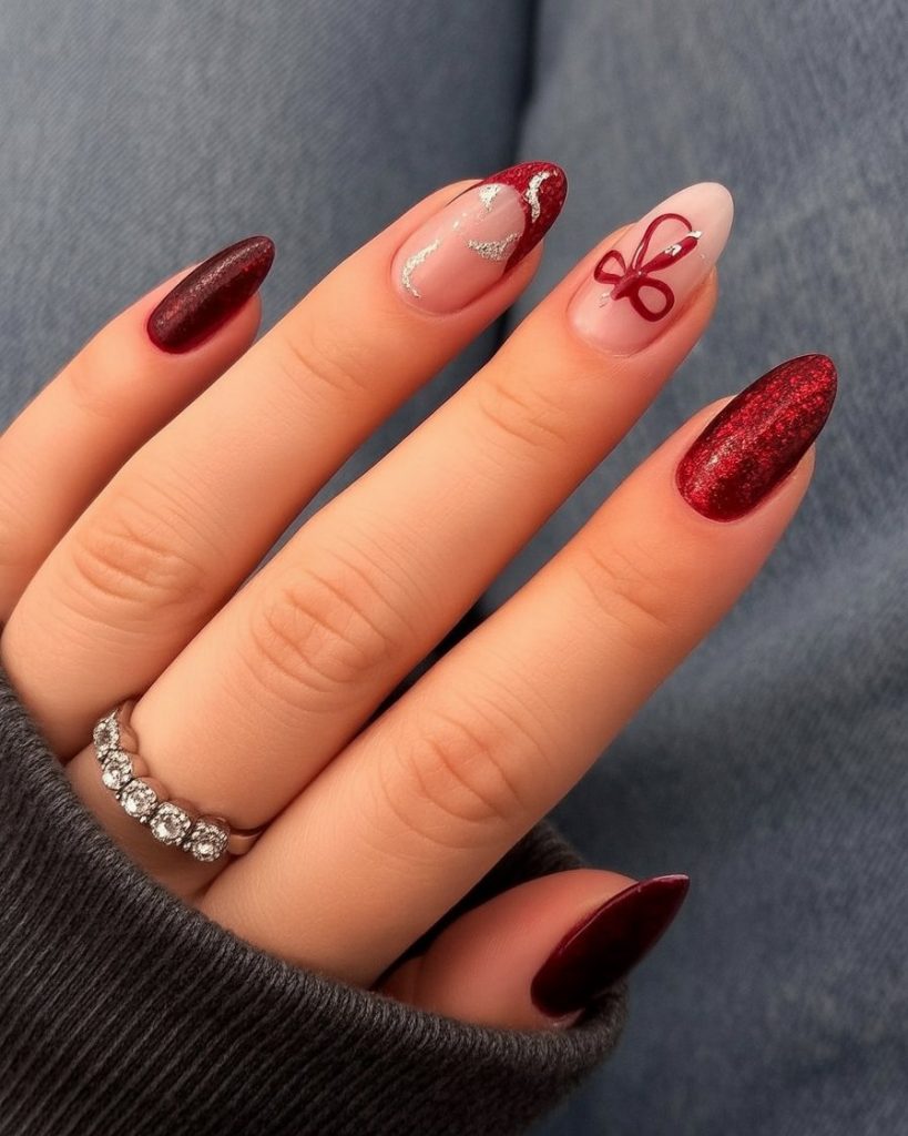 I find these nails too irresistible to resist because it’s as if each fingertip has been wrapped into a tiny present. The deep red-glitter color, combined with the silver sparkle, is great for setting an occasion mood; meanwhile, the bow accent makes it a statement of charm and sweetness. It’s a bit joyful and playful, yet grown-up—just right when you want to get a bit of festive spirit without the cliché.