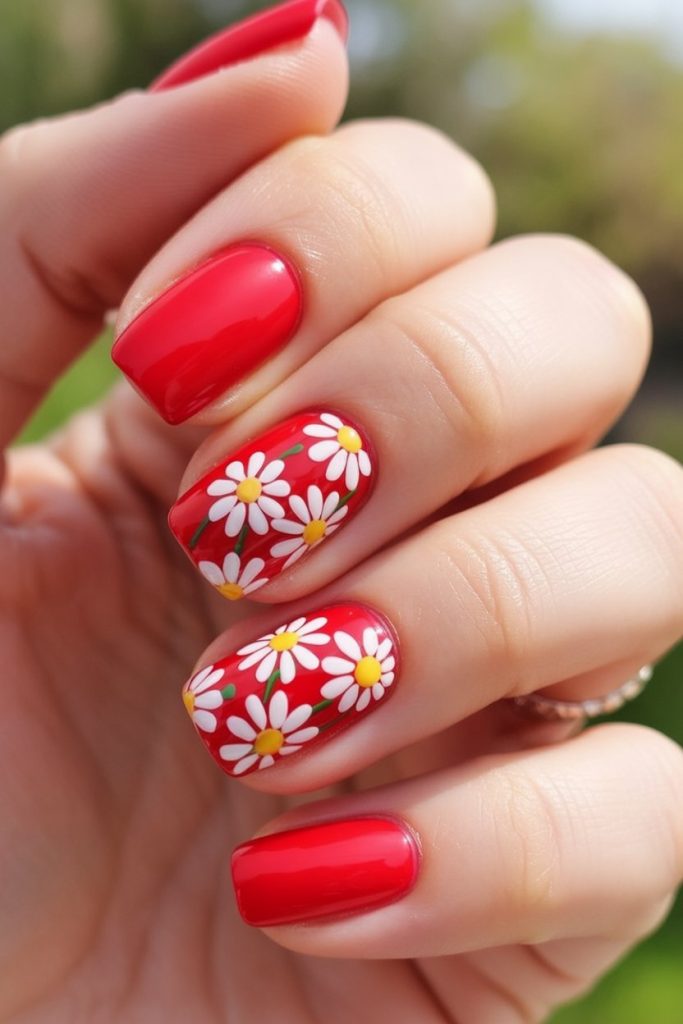 Bright red paired with happy white daisies creates a manicure that feels playful and sunny. This design has a retro-inspired charm, almost like a nod to 70s floral prints, yet it feels fresh and modern. The daisies pop beautifully against the glossy red, making the nails stand out without being overdone.
