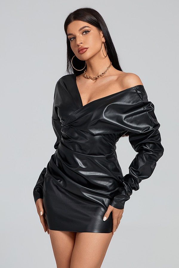 This off-shoulder black leather dress with its dramatic sleeves adds a touch of opulence to the leather dress outfit 2024 roster. It’s a bold choice for an evening occasion, especially when styled with minimalist jewelry and heeled boots.