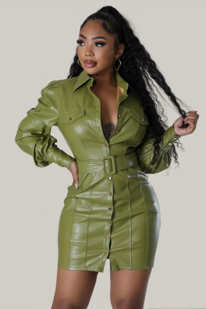 For those who prefer their leather understated, an olive green midi leather dress offers elegance with an edge. Ideal for a leather dress outfit casual or a leather dress outfit with jacket, this dress works well with ankle boots or strappy sandals, making it a year-round staple.
