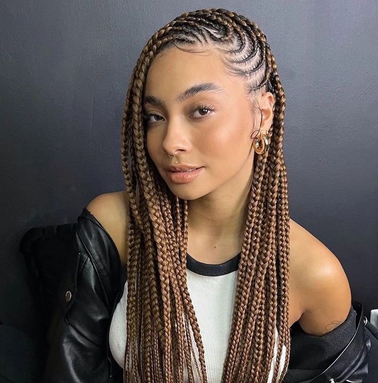 These long, honey-toned box braids incorporate side cornrows for added detail and texture. This protective style is both fashionable and functional, providing a low-maintenance, versatile option that can be dressed up or down.