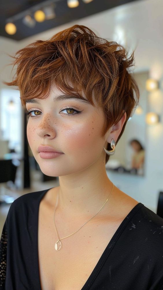 A playful, textured pixie cut with tousled layers that add volume and movement. This chic, face-framing style enhances natural beauty and brings out the eyes, making it ideal for a fun, effortless look.