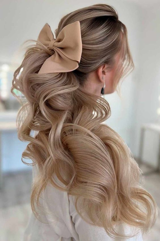 For those seeking a blend of grace and ease, a soft taupe bow accentuates the cascading curls of this half-up, half-down hairstyle. Perfect for a day at the office or a casual brunch, this style speaks to the ‘Easy special’ category, offering a look that’s both effortless and refined.