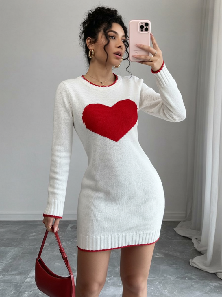 If Valentine’s had a “cute but confident” uniform, this would be it. The clean white knit feels cozy and polished, and that bold heart detail hits the sweet spot between playful and grown-up. It’s the kind of Valentine’s dress that says you’re celebrating, but you’re not trying too hard—just effortlessly charming with a little wink. I love how it gives cozy romance without drifting into cheesy territory, which is honestly the hardest balance to nail. Who it’s for: this is a dream for anyone who wants a streamlined outfit that still feels soft and comfy, especially if you like simple silhouettes with one standout detail. If you’re curvier, the knit can be super flattering—just choose smoothing underlayers if you prefer a clean line. For impressive outfit ideas, add sleek heels or tall boots, keep jewelry minimal, and let the heart do the talking. It’s also a solid outfit aesthetic choice for a casual dinner, movie night, or a low-key classy women’s night.