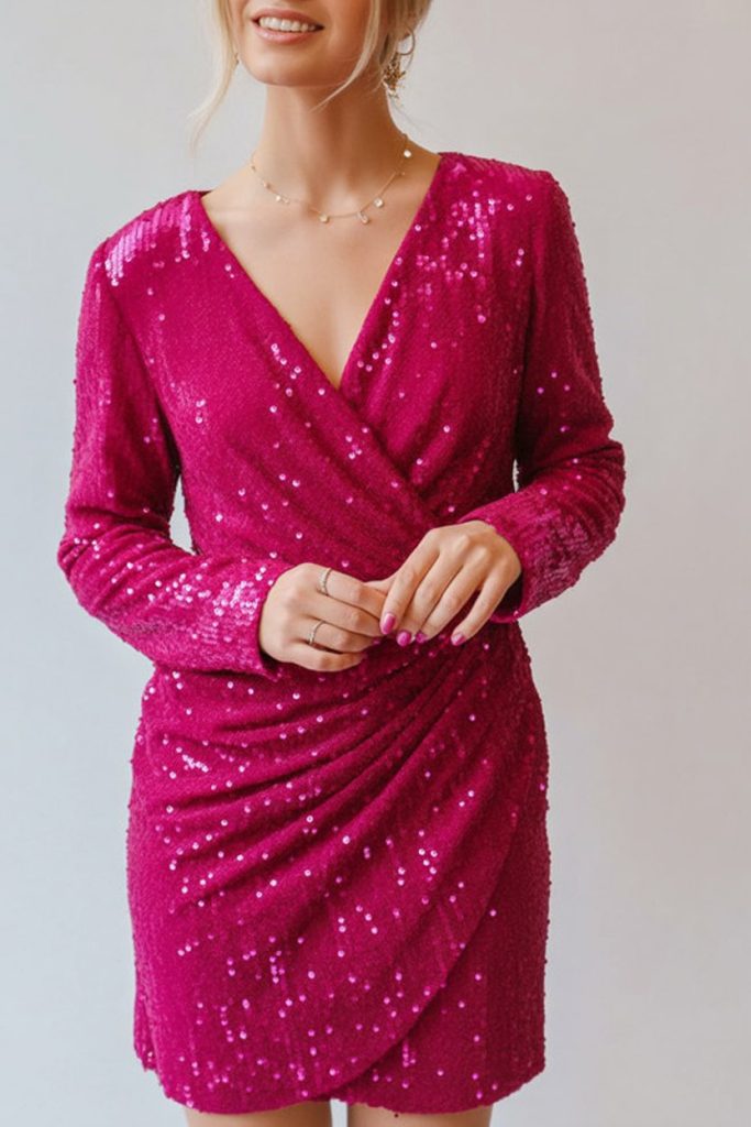 This is the “walk in and sparkle” kind of Valentine’s dress—bold, confident, and unapologetically fun. The pink sequins bring instant party energy, while the wrap shape keeps it flattering instead of overwhelming. It feels like the outfit version of a champagne toast: a little flashy, a little flirty, and totally ready for a night where you want to be noticed (in the best way). If you’ve been craving something that screams “impress” without saying a word, this one gets the job done. What makes it special is how the wrap styling naturally defines the waist and creates a clean, confident line. Keep your shoes simple—nude, metallic, or black—and let the shimmer stay center stage. For code ideas that feel modern, do sleek hair, sharp eyeliner, and one statement earring. It’s perfect for women’s classy night plans where you want a formal vibe, but you still want to have a little fun with it.