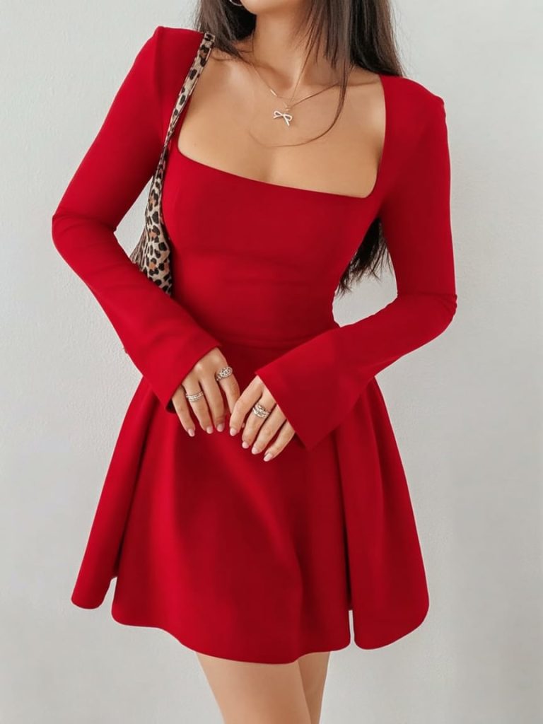 This is classic romance with a clean, modern twist. The structured square neckline looks so chic, and the fit-and-flare shape gives you that confident, feminine silhouette that feels instantly “special occasion” without feeling stiff. It’s red in the most timeless way—bold, flattering, and very much a to-impress outfit moment. If you want a Valentine’s dress that feels elegant but still playful, this is a strong yes. Low-maintenance angle: the shape does the styling for you, which makes it perfect when you want to look amazing without a long getting-ready marathon. Keep hair sleek or do an easy upstyle to highlight the neckline, and stick to simple jewelry. This also fits a wide range of outfit code ideas—dress it up with heels for a classy women’s night, or soften it with a tailored coat and minimal makeup for a more relaxed aesthetic. It’s one of those reliable outfit ideas you’ll reach for again.