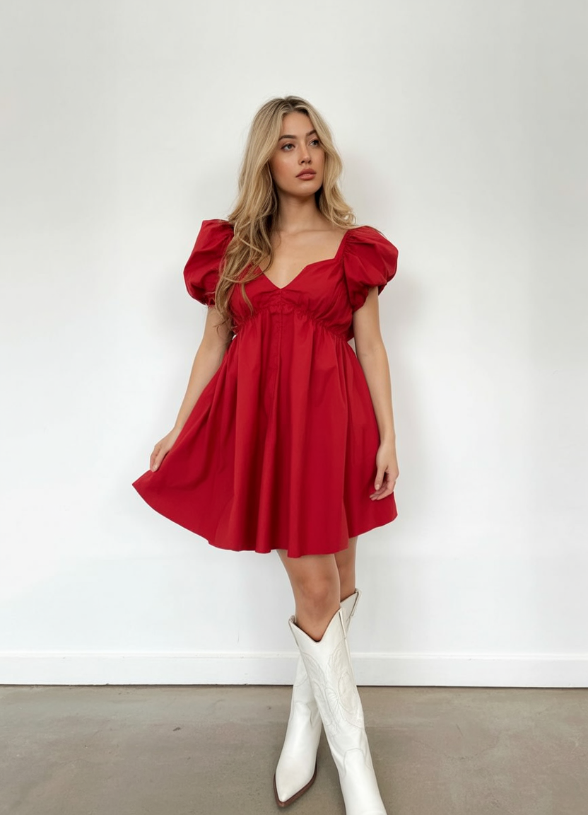 3. Puff-Sleeve Red Mini with Western-Modern Boots
