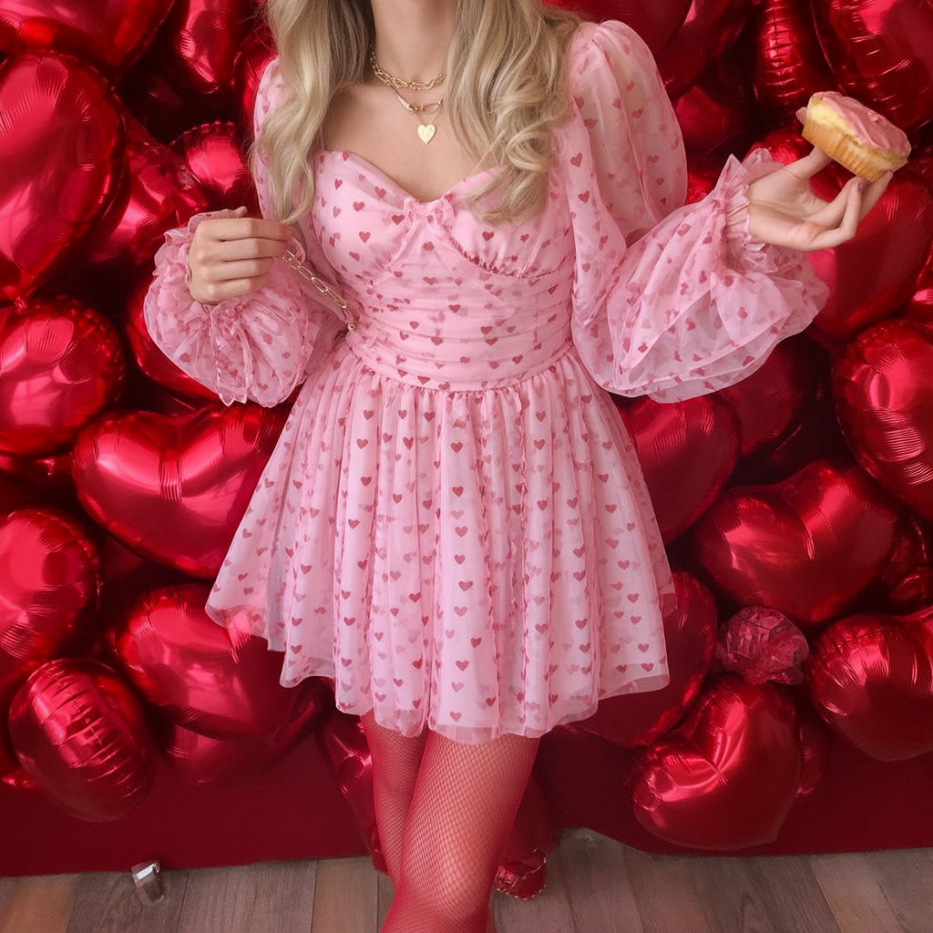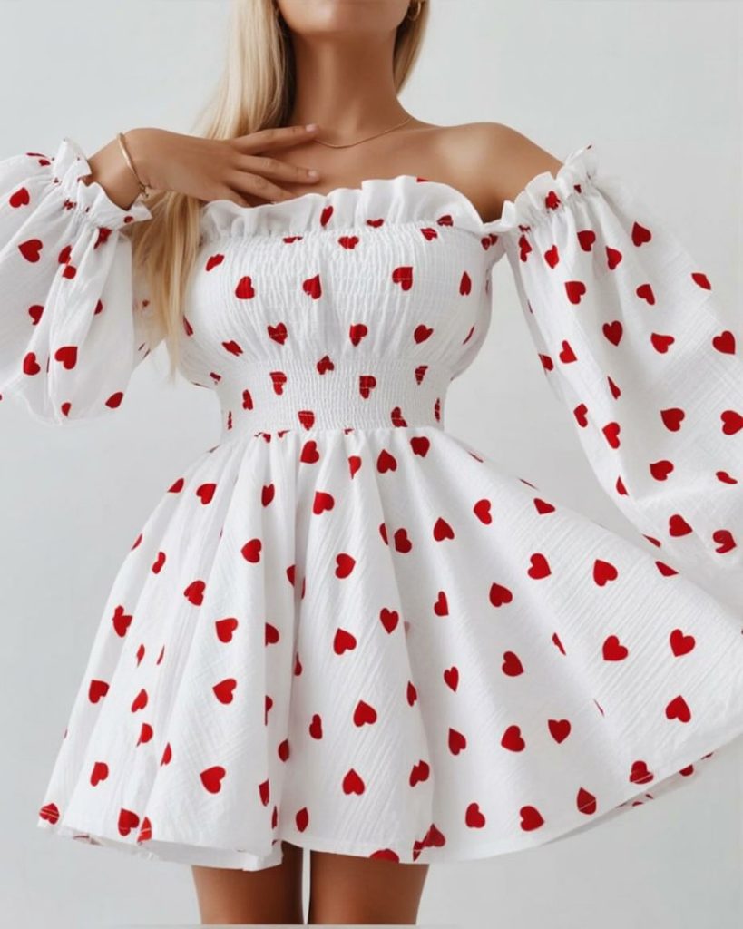 This dress is sweet in a fresh, airy way—like the grown-up version of your romantic daydreams. The heart print feels playful, but the silhouette is the real magic: floaty, feminine, and a little dramatic when it moves. It’s the kind of Valentine’s dress that makes you want to plan something fun just so you have an excuse to wear it. Trend-wise, this fits the 2025-to-2026 shift toward soft-volume silhouettes and romantic details that still feel modern. Keep makeup simple and glowy; you don’t need heavy glam here. For impressive outfit ideas, add delicate heels and a structured mini bag so it feels polished, not costume-y. It also works beautifully as Ideas’ Valentine’s Day outfit when you want something light, bright, and memorable.