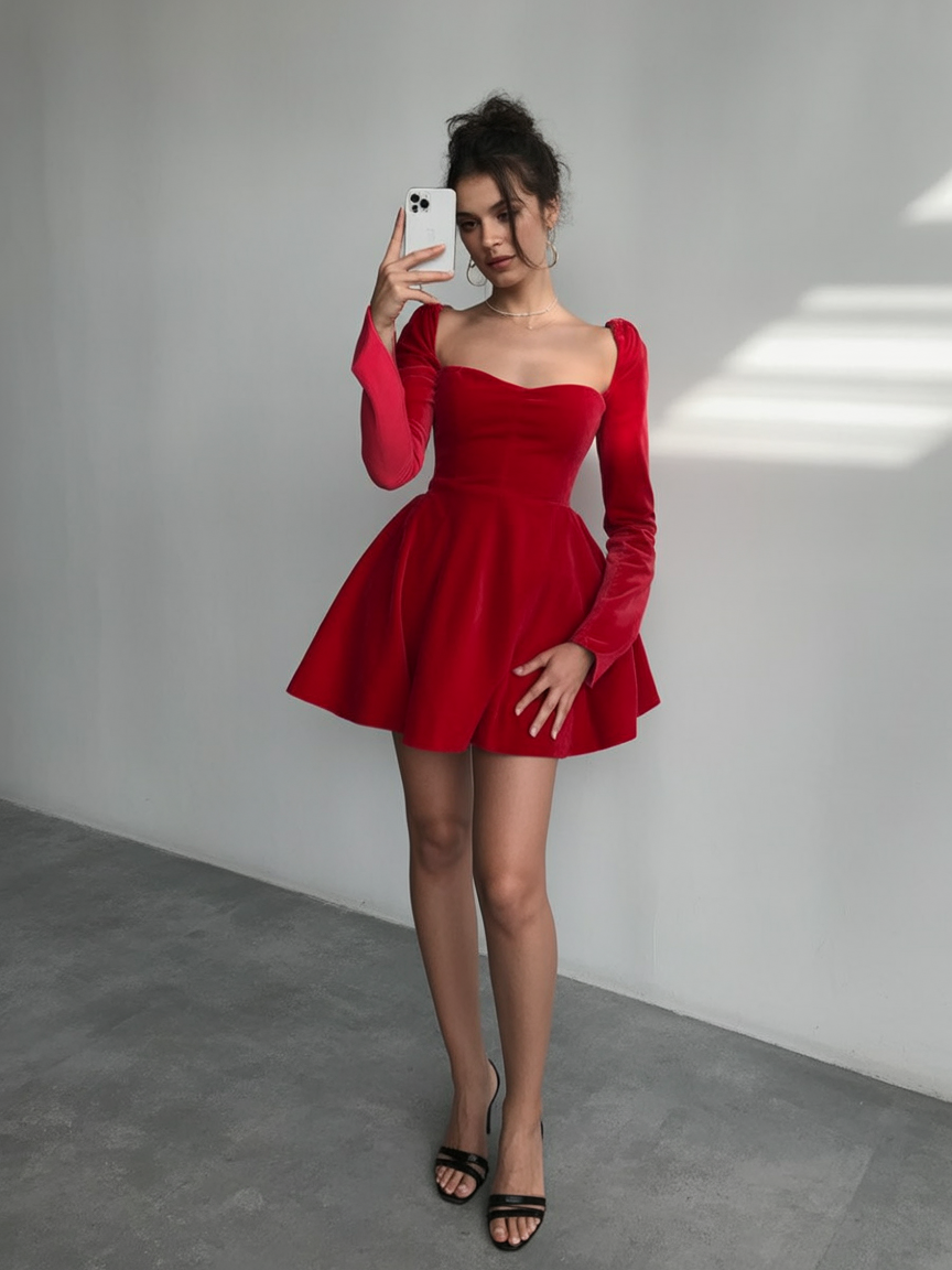 This is the kind of Red moment that makes you stand a little taller without even trying. The clean neckline feels romantic but not fussy, and that swishy skirt brings instant “main character” energy—flirty, confident, and just dramatic enough for a Valentine’s dress without feeling costume-y. It’s polished, but it still has that playful sparkle you want when the night is about feeling cute and seen. Styling-wise, keep it sleek: a soft blowout or an upstyle keeps the neckline looking intentional, and a simple lip plus defined lashes is all you need. If you’re building to impress with outfit ideas, go with minimal jewelry and let the dress do the talking. Works beautifully for women’s classy night plans—dinner, cocktails, or any formal vibe where you want to look effortless but unmistakably put together.