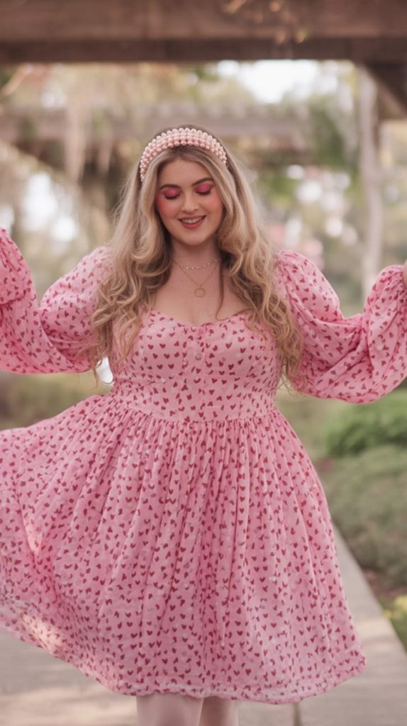 This dress feels like joy—soft pink, romantic hearts, and sleeves that bring a little drama in the most flattering way. It’s sweet, yes, but it also feels confident and celebratory, like you’re leaning into Valentine’s without apologizing for it. The fullness and movement give it that “special day” energy, and the overall vibe is warm, feminine, and totally camera-ready. Honestly, it’s the kind of look that makes you want to plan something fun just to wear it. Motivation to try it now: if you’ve been stuck in “safe” outfits, this is a gentle way to step into something bolder while still feeling comfortable. The puff sleeves balance the silhouette beautifully and add that romantic aesthetic that’s so popular right now. For women’s classy styling, keep accessories simple, go for a soft glam makeup look, and choose neutral shoes so the pink stays the focus. It’s a strong option for Valentine’s Day outfit ideas when you want to feel fresh, pretty, and genuinely excited to get dressed.