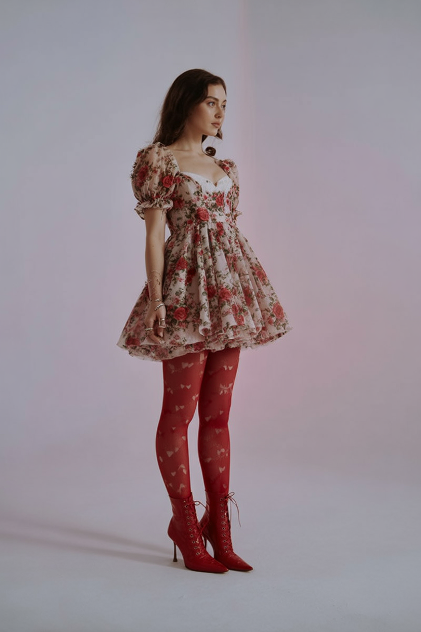 2. Vintage Floral Puff-Sleeve Mini with Romantic Tights