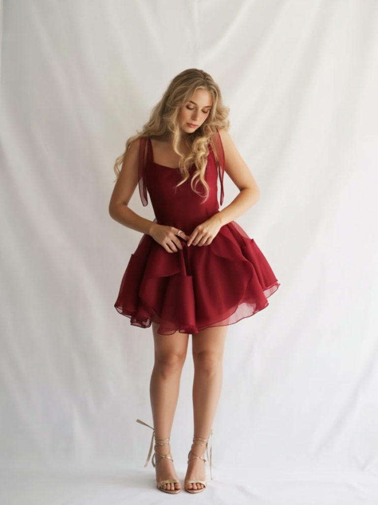 This dress feels like a romantic little swirl—soft layers, light movement, and a color that’s richer than basic red. It has that dreamy, floating effect that makes you want to dance, even if the plan is just dinner and dessert. The overall mood is feminine and a little dramatic, but in a “quiet luxury” way. It’s the kind of Valentine’s dress that looks expensive and delicate without trying too hard. Comparison-wise, if a bodycon feels too intense and a big ballgown feels like too much, this sits right in the middle—flirty, comfortable, and still special. The layered skirt adds movement and a little volume, which is great if you like a softer shape. For impressive outfit ideas, pair with nude or metallic heels and a simple clutch; keep hair romantic (soft waves or a low bun). It’s a beautiful pick for women’s classy styling when you want elegance with a playful edge.