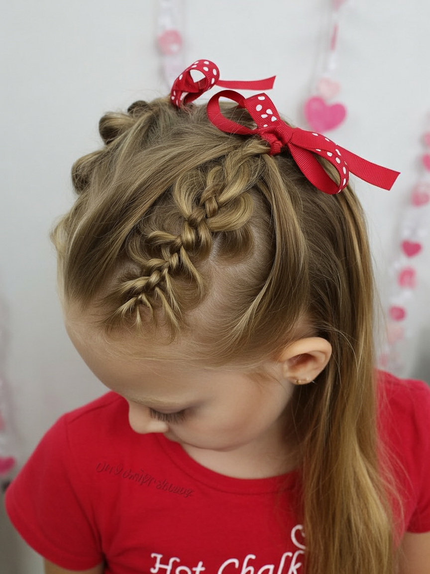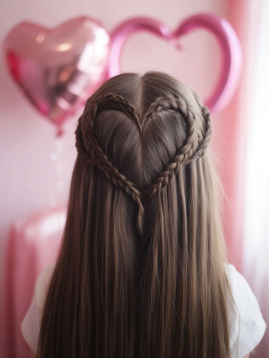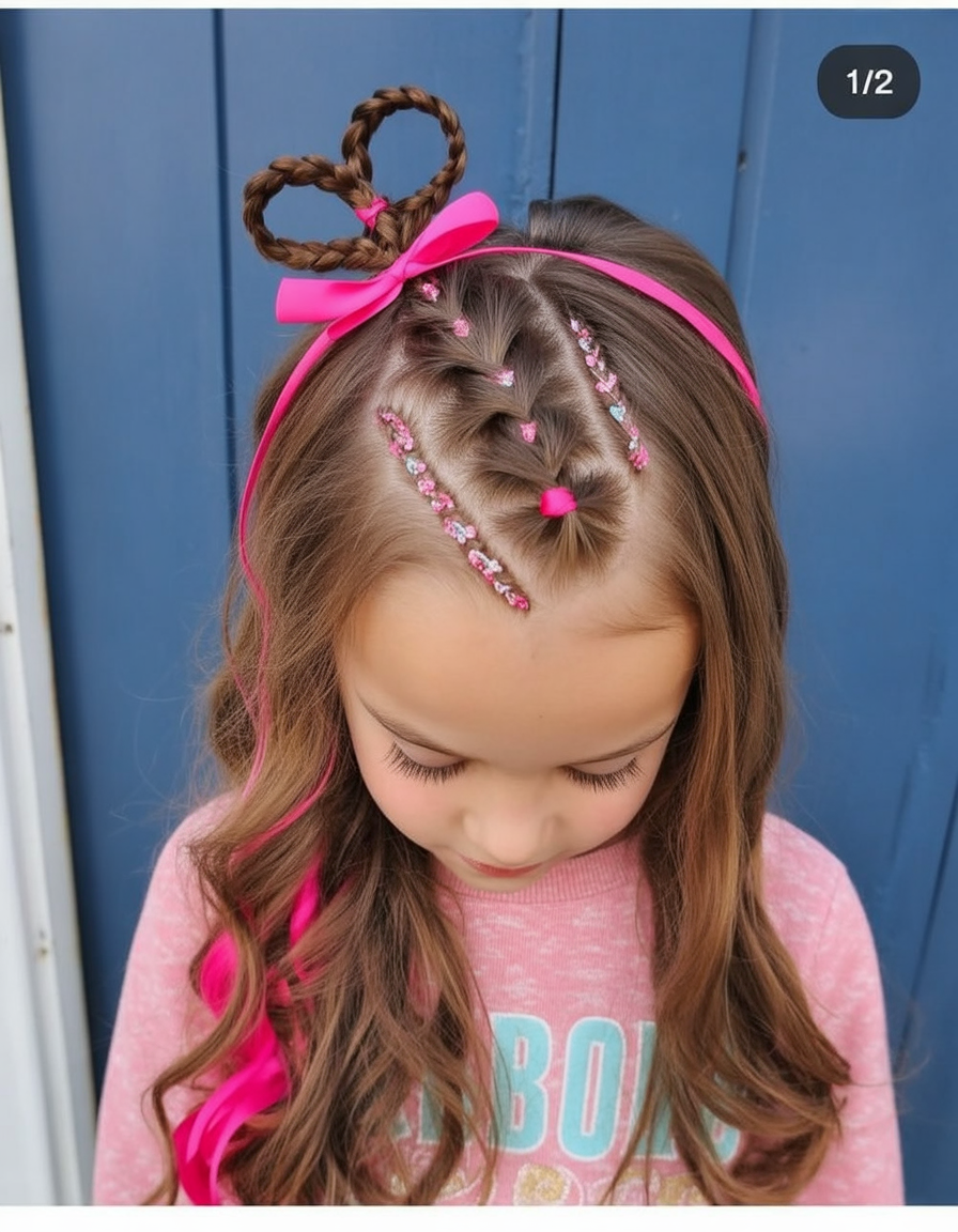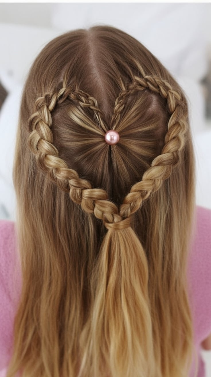This is the quintessential Valentine look: two neat braids curve around to form a picture-perfect heart, meeting at the center with a pearl accessory and a simple half pony. It’s soft, sweet, and timeless, the kind of hairstyle that works just as well for classroom parties as it does for a family dinner or a little photoshoot at home.